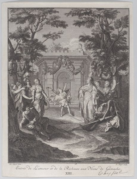 Curator: Jacob Folkema, working in 1721, created this intricate engraving titled "Allegorische figuren in een tempel," currently held in the Rijksmuseum collection. Editor: Whew, what a scene! It's like a grand opera froze mid-performance. Everyone's poised, you know? Not exactly alive, though...more like…elegantly stuck. Curator: Note the masterful deployment of line. Folkema’s skill yields clarity and depth in rendering both the architectural setting and the figures. The interplay of light and shadow accentuates the idealized forms. Editor: Idealized is…generous. All those chubby cherubs could use a modern pilates class, no offense to Baroque aesthetics, of course. But it’s got this playful thing happening amid the serious temple setting—it's a party and a historical tableau all rolled into one. Curator: The temple setting, richly detailed, is clearly the site for some form of allegory. Its careful rendering points to an intentional effort to structure the figures within a theoretical frame. We can analyze the architecture for clues to unpack Folkema's message. Editor: Or…maybe it’s just a stage? All the figures frozen in position... What's the story, I wonder? The woman with the instrument seems central, but her eyes are blank, distant. She doesn’t seem connected. What's with that winged figure whispering in the seated figure's ear? Gossip? Conspiracies? It hints at secrets behind all that grand display. Curator: This engraving, on one level, encapsulates Baroque ideals—the ornamentation, theatrical composition, the sheer density of symbolism all mark it firmly within that tradition. However, it simultaneously presents us with elements ripe for deconstruction. Editor: Deconstruction or plain old human mess? I'm oddly charmed by its elaborate stagecraft, its hidden tensions. Art of that period makes me wonder what these scenes say about their everyday life and concerns back then! I see you trying to find what the figures are an "allegory" *of*, though. Curator: Exactly. Through detailed analysis, we can discern the coded societal references and extract the essence Folkema sought to immortalize in the lines of this engraving. Editor: Immortalize, or capture a moment? Whatever it is, this piece definitely offers more than pretty decorations. Curator: Precisely. Hopefully, visitors now feel a richer connection with "Allegorische figuren in een tempel". Editor: Agreed. Next time, though, less temple, more pilates?