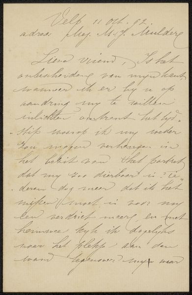Curator: This is "Brief aan anoniem," or "Letter to Anonymous," possibly from 1888, by Johan Hendrik Weissenbruch, housed here at the Rijksmuseum. It’s ink on paper. Editor: A letter! Well, doesn’t this feel intimate and rather vulnerable? Just looking at the delicate, spidery script, I feel like I’m intruding on someone’s private thoughts. Curator: It does have that quality. As a drawing—since it's filed as such—it invites a different kind of reading, where the pressure of the pen, the absorbency of the paper, and the very act of writing become sculptural. Editor: It looks like he wrote the date and a location up at the top – ‘s Hage, December 3, 1888, but is that just part of the art itself or something functional? Was the creation of letter as functional piece for communication ever artful? Curator: Absolutely. Weissenbruch saw art in the everyday and elevated the humble act of letter writing through attention to the sheer materiality of the ink, the grain of the paper... he transformed a fleeting gesture into something monumental, something worth preserving, beyond the message itself. Editor: You know, the very existence of this letter raises so many questions. Who was the intended recipient? What secrets did it hold? And why was it ultimately kept, preserved even? This fragile document whispers of lost connections and untold stories. Curator: Think of the labor involved: grinding the ink, preparing the paper, the focused concentration required for calligraphy. It really does challenge that whole dichotomy of high art versus craft. Editor: For me, viewing this through the lens of material engagement unlocks an emotional narrative beyond just its calligraphic elegance or documentary importance. I imagine a slow burn, perhaps a painful one, where words become art because emotion fuels the writing process. Curator: That hits on something real about his dedication, transforming functional prose into a preserved personal artifact. Each stroke becomes a record not just of a thought but also a labor and the material realities that contain it. I come away feeling as if I’ve caught something transient yet eternal, raw and deeply human. Editor: And in it, I feel connected to an unknown person, across the divides of time and class, to those mundane everyday tasks – perhaps this is what makes the artistic moment even more profound and humanly relatable.