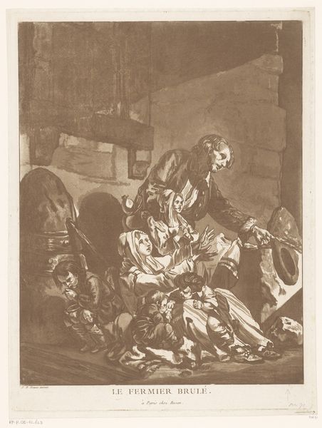 Editor: We're looking at George Bellows' "Made in Germany," housed at the Harvard Art Museums. I’m immediately struck by its darkness, both in subject and tone. What do you see as you examine the composition and the artist’s use of light and shadow? Curator: The stark contrast is indeed compelling. Notice how Bellows employs chiaroscuro, almost theatrical in its intensity, to emphasize the brutality. The composition directs our gaze to the central struggle, framed by receding figures. What effect do you think this dramatic lighting achieves? Editor: It definitely amplifies the emotional impact. The bright figures appear vulnerable and victimized. The figures in the background fade into shadows, and it’s overwhelming. Curator: Precisely. Consider the formal arrangement: the diagonal thrust of the figures, the jagged lines of the landscape. Bellows uses these elements to create a sense of unease. Does this linear arrangement alter your reading of the print? Editor: I can see the diagonal now, and the jagged lines! It definitely evokes a sense of tension and disequilibrium. Thank you!