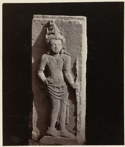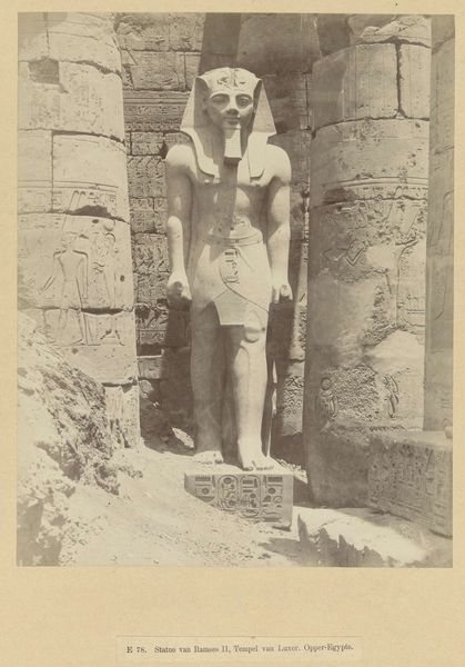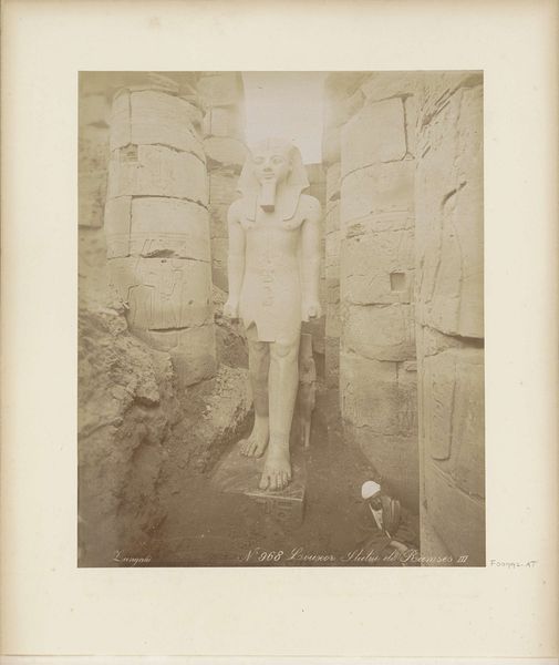 Curator: This is a photograph titled "Syout (Lycopolis), Statue Appartenant au Docteur Cuny" created between 1851 and 1852 by Félix Teynard. It's currently held here at the Metropolitan Museum of Art. Editor: It's remarkable. The weathered textures give a haunting, ethereal quality. The pose is so static yet dignified, and there's a solemn power radiating from it. Curator: Absolutely. Teynard's work offers valuable insight into 19th-century European engagement with Egyptian artifacts. Focusing on production, we see how photographic expeditions aided in documenting and ultimately possessing cultural heritage. These images helped to satisfy European desires for the exotic. Editor: Yes, but let’s look at the artistic execution here. The use of light and shadow is impeccable, really highlighting the sculpture's form. There's such a stark contrast between the smooth facial features and the deeply etched hieroglyphs on the base that it gives the image so much visual depth. Curator: Consider, too, Doctor Cuny, whose statue this was. What social status did he hold that allowed him this possession, this depiction? These early photographs provided accessible replications for the upper classes to study and acquire. Editor: I’m more intrigued by the composition itself. See how Teynard frames the statue—the angle, the positioning within the frame… It's not just documentation; it's an interpretation, shaping how viewers perceive it. This contributes to the aesthetic value. Curator: The scale of this work too—the large calotype print enabled details to be viewed on a scale unseen until then. How this contributes to the study and collection habits within a European framework tells a greater story than what we first see in its composition. Editor: It highlights the essence of ancient Egyptian art—its permanence, its iconic representation of the figure. It also showcases the capabilities of early photography, proving itself an artistic medium capable of capturing—and transforming—the beauty of sculpture. Curator: Understanding both artistic representation and the material circumstances through which art travels gives a deeper appreciation. Editor: Precisely, appreciating the convergence of artistic form and historical, cultural contexts opens new perspectives.