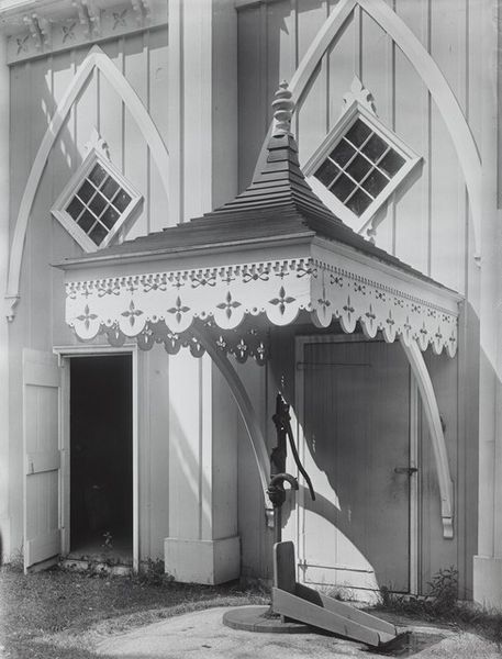Curator: Here we have Aaron Siskind’s “Tabernacle City 3,” a gelatin-silver print created around 1935. Siskind was deeply involved with the Photo League, and this work resonates with that spirit of social document and artistic expression. Editor: It's strangely soothing. The sharp lines of the architecture softened by that dreamy, almost glowing, white curtain behind the windows. The repetition of form makes me feel calm. Curator: Absolutely, but I think it goes beyond just surface aesthetics. Siskind’s involvement with the Ashcan School is crucial here. These photographers sought to capture everyday life, especially the lives of working-class people. The architecture here reflects a certain time, possibly a space of sanctuary but certainly one rooted in class dynamics. Editor: I see what you mean. The shutters feel very “every home should have this”. What seems soothing could be seen as static or restricted. Curator: Precisely. And think about the “city” in the title, there is more architecture than organic structures in this capture of the cityscape. These geometric shapes represent social systems, especially when seen in light of Modernism where form follows function. It prompts us to reflect on who builds these systems, and for whom? Editor: Yeah, the architecture feels… assertive. Maybe not intentionally, but those straight lines have a certain force, especially contrasted with the light filtering through the curtains inside. There is an implied privacy, something sacred implied. Curator: Which gets back to the title "Tabernacle City 3," drawing connections between domesticity, sacred space, and civic architecture. Siskind urges us to critically examine these interlinked societal pillars and who may or may not benefit from them. Editor: For me it’s more about that tension, the dialogue between light and shadow, rigid lines and the organic chaos behind those curtains. But I think we are both responding to how such a simple-seeming photograph speaks to so much more when you really begin to explore it. Curator: A critical examination of these often-overlooked elements is more crucial than ever. Siskind’s photographs make a powerful statement. Editor: Yes, what at first seems like a soothing and attractive photo transforms into a stark commentary on both our personal space and collective well being.