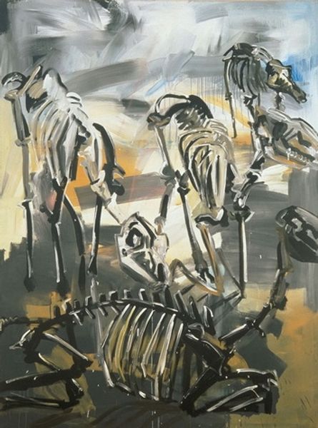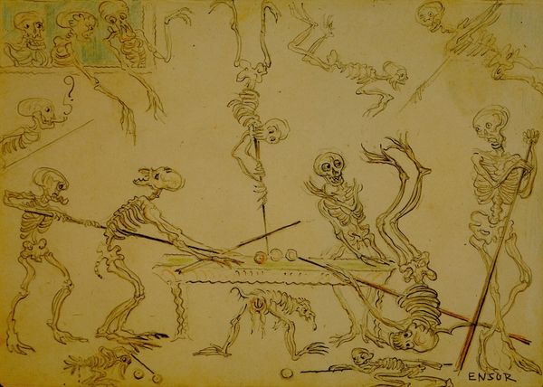 Nils Dardel made this painting of skeletons using watercolor. Dardel's choice of watercolor, typically associated with preparatory sketches or amateur art, feels pointed here, given his subject matter. The pale, translucent washes create a sense of fragility, almost as if the skeletal figures could dissolve back into nothingness. But, the way Dardel has built up layers of pigment suggests a slow, deliberate process. The skeletons become more than just symbols of death; they are beings brought into existence through a kind of patient, painstaking labor. There’s a tension here between the lightness of the medium and the gravity of the theme, challenging traditional distinctions between craft and fine art. This invites us to consider the work involved in making art, and the art involved in facing our own mortality.