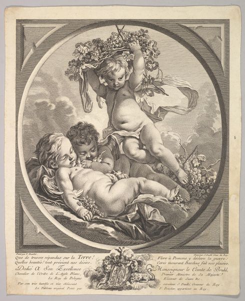 Etienne Fessard created this print, L’Autonne, after an original painting by Watteau, published in the mid-18th century as part of a larger collection. The composition immediately draws us in with its oval frame and the swirling figures that seem to spill out of it. Notice how the artist masterfully uses light and shadow to create depth, guiding our eyes through the scene. The figures, arranged in a pyramidal structure, evoke a sense of classical balance, yet there is a dynamic energy in their poses and interactions. The satyr pouring liquid into a chalice, the reclining figure with a staff, and the playful children create a scene of abundance and celebration, typical of allegories of Autumn. The print functions as a semiotic system, where each element—the figures, the setting, the objects—carries symbolic weight, engaging in a dialogue about nature, pleasure, and the transience of seasons. The very act of engraving, translating paint into line, adds another layer of interpretation, prompting us to consider how art transforms and preserves meaning across different forms and eras.