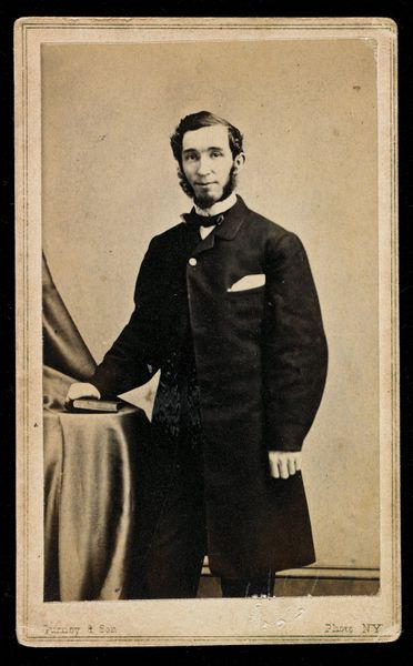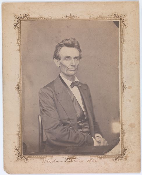 Curator: The somber weight of history feels palpable in this stereograph by Mathew Brady, portraying Abraham Lincoln. Editor: It's striking how the dual image lends a strange depth and almost hallucinatory quality to the photograph. The tones are muted, which emphasizes the gravity of the subject. Curator: Brady captured Lincoln at a pivotal time, during the Civil War, shaping and preserving Lincoln’s image for future generations. These portraits helped solidify Lincoln's place in the American consciousness. Editor: The meticulous detail is captivating; see the minute textures of his suit, the carefully controlled lighting. It's less about capturing a likeness and more about constructing an idea of leadership. Curator: Indeed. Photography in this era was crucial for disseminating political imagery and influencing public perception. Brady's gallery played a key role in this process. Editor: And the repetition! It's like a doubling of the man himself, forcing us to confront his presence, his otherness, from two slightly different perspectives. Curator: Ultimately, Brady's portrait immortalizes a leader, but it also reveals the power of photography to shape history and collective memory. Editor: A powerful piece indeed—a reminder that even in stillness, images can resonate with profound movement.