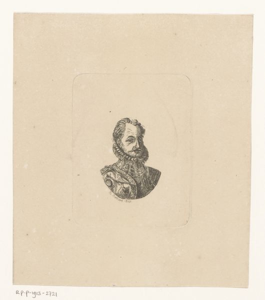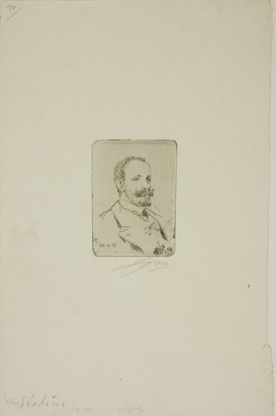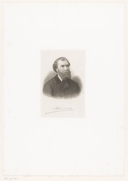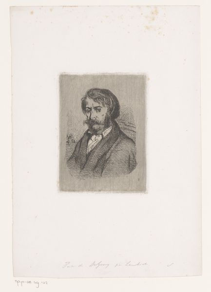 Curator: Before us is a portrait rendered with delicate precision, an engraving made by Fréderic Auguste La Guillermie between 1851 and 1907. The subject is Franҫois-Joseph Duret. Editor: It's quite a severe image. He has a very direct gaze and a hint of a frown. The subtle lines almost give him a haunted quality. Curator: It’s interesting that you see severity. During this period, portraits were often commissioned as emblems of status. Duret, we know, was a sculptor, so such depictions played a crucial role in the art world's visual economy, cementing reputations and shaping public perception. Editor: Yes, and that sculptor's identity might inform some of his imagery. Note his carefully groomed beard and neatly tailored jacket with what seems to be a lapel pin – all contribute to the established archetype of the 19th-century professional. One cannot dismiss the pin. Its a symbol denoting achievement that surely informed public perceptions and possibly aspirations, even if on a subconscious level. Curator: Precisely! And engravings, as reproducible images, democratized access to portraiture. Rather than a unique painting, this print allows for wider circulation and, therefore, influence. Its existence suggests the development of a more diverse, though not altogether more egalitarian, art world. Editor: So this portrait does not serve as only a likeness, but becomes part of his continuing narrative; part personal and part projected out toward an ideal. Considering he worked in stone, do you suppose he had opinions about the new technologies enabling printed portraits? Curator: I would think that like all creatives, he regarded its democratizing power as essential to art appreciation, but possibly threatening to the individual artist. Editor: Well, this deep dive has left me considering my assumptions. Thank you for sharing your historical perspective. Curator: Likewise. It's vital to see artworks as participating within wider visual and material cultures.