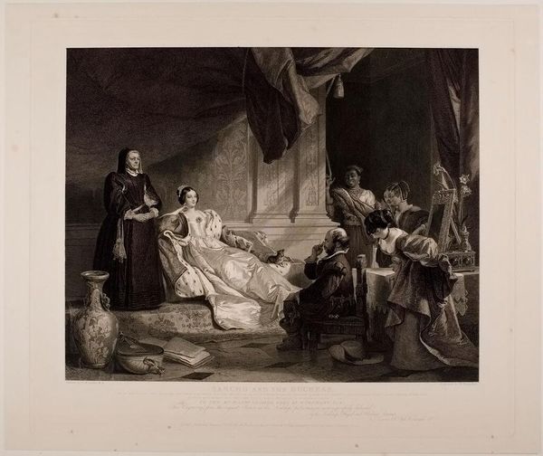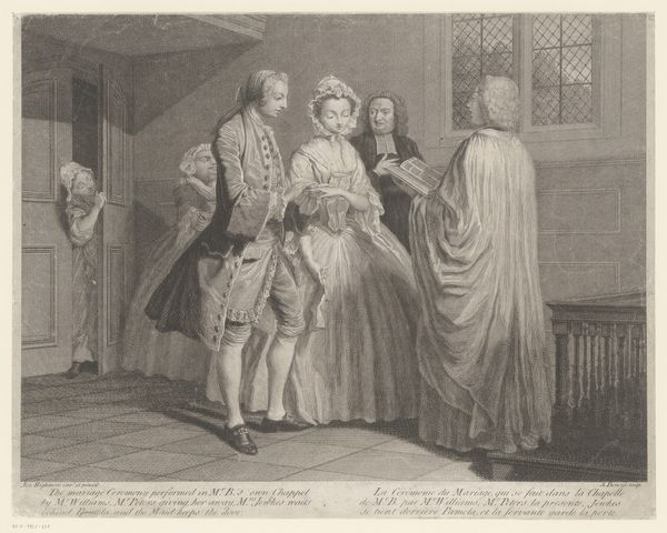 Curator: Here we see Joseph Highmore's "IX: Pamela is Married," part of a series inspired by Samuel Richardson's novel, now residing at the Tate. It captures a pivotal moment, doesn't it? Editor: It does! The textures of the clothing feel so important. All that billowing fabric, the shimmer of the bride's dress. You can almost feel the weight of it all. Curator: The series, and this painting, really brought the novel's social commentary to a wider audience, beyond the written word. Highmore was quite savvy in tapping into that popular narrative. Editor: And it speaks to the emerging culture of mass consumption. The novel as commodity, and now the art based on it, reproduced and disseminated. The material conditions are fascinating! Curator: Absolutely. Highmore's series offered a visual narrative that reinforced the moral message and the social structures the novel explored. Editor: The materiality of the event – the clothes, the ritual – all reinforcing the social order through the production of this image. Curator: It's really a fascinating illustration of how art, even then, was deeply embedded in cultural trends. Editor: Yes, and seeing the novel's themes translated into paint reminds us how narratives gain power through their material existence.