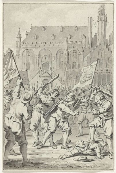Editor: Here we have "Fight Between Two Armed Men," a pen, ink, and print drawing by Abraham Dircksz. Santvoort from 1667. It looks like a scene from a play, maybe? What do you see in this piece? Curator: I see a snapshot of power and performance deeply embedded in 17th-century Dutch society. While ostensibly depicting a fight, it speaks volumes about societal structures, masculinity, and the glorification of conflict. Look at the crowd – their presence normalizes, even celebrates, this display. Who do you think holds power in this scene, and how is that power being represented? Editor: Well, the guys fighting, I guess. They’re at the center, drawing all the attention. Curator: But what kind of power are they wielding? Is it personal, physical prowess? Or is it symbolic, representative of larger political or social tensions? And consider the audience: are they merely spectators, or are they active participants in reinforcing this spectacle? What narratives are being promoted, and who benefits from them? Think about the social hierarchies at play and how gender, class, and perhaps even colonial power, influence this “fight”. Editor: So it's not just about two guys fighting, but more about what their fight *means* to everyone else? How the elites are maintaining their control by putting on a spectacle? Curator: Precisely. By exploring these connections, we gain a richer understanding of the work. This piece reflects back how we deal with contemporary themes such as power and control and conflict. What might a contemporary reading of this image look like to you, with our current understandings of these same societal pressures and systems? Editor: That’s…a lot to think about. I never would have considered all of that! Thanks! Curator: It's a pleasure! The beauty of art lies in its ability to ignite critical conversations across centuries.