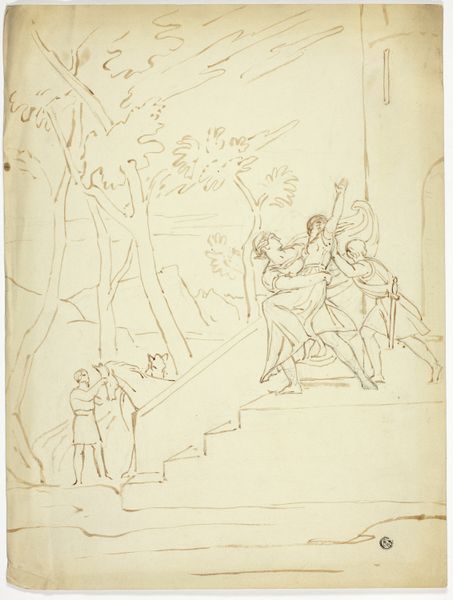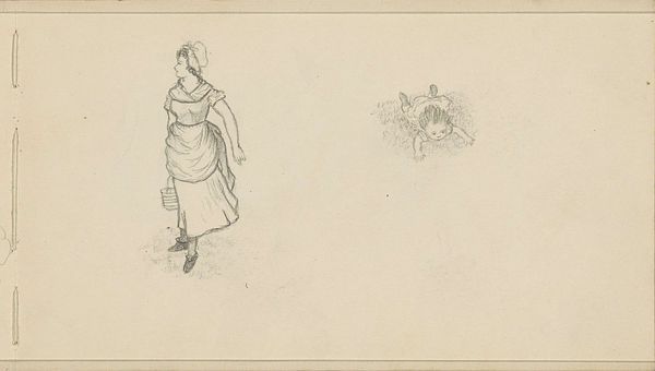 Curator: Alright, let’s take a look at “The Mice Escape,” a watercolour and ink drawing on toned paper by Beatrix Potter, dating back to 1902. What strikes you first? Editor: Well, there's an unsettling, almost surreal atmosphere hanging in the air. It's like stepping into someone’s dream or a peculiar stage play where the props and players feel both familiar and strangely distorted. Curator: Indeed. Potter really excelled at creating these liminal spaces, didn’t she? Look at how she uses perspective to give the sense of a slightly tilted reality. The eye is drawn to the gentleman, meticulously placing a teacup back on the shelf, utterly oblivious to the flurry of mice that occupy his kitchen. It's a charming genre scene punctuated by hints of impending chaos. Editor: Chaos definitely brewing there! The sheer number of mice scuttling across the floor creates a kind of visual rhythm—a frantic energy underscored by those long, wiry tails that create linear patterns on the tile work. How does this detail fit within a formal reading of the piece? Curator: It speaks to the inherent dynamism within supposedly static environments. Even here, Potter injects life. You almost feel the scratching of tiny claws, don’t you? She’s known for children stories, of course, but what does this work say? I think she’s asking viewers to reflect on the quiet rebellion of the unnoticed—a whimsical yet incisive commentary on the natural order and those little disruptions we often ignore. Editor: Yes, this subversion is potent. She also is hinting at some sort of system where something is obviously amiss. Are the mice simply invading, or reclaiming something? Maybe what they're doing isn't misbehavior after all. She understood, didn't she, how the overlooked aspects of the mundane are what shapes lived realities, no? Curator: Absolutely! This seemingly simple drawing reveals how careful formal analysis reveals these layers of deeper significance—something Potter was masterful at imbuing. The entire piece takes on this additional vibrancy and speaks more than at first glance. Editor: I agree; she was quietly profound and left breadcrumbs for future eyes and minds.