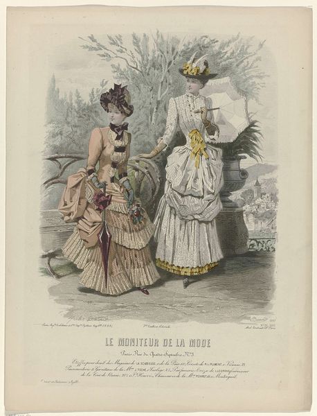 This fashion plate, published in 1886, presents an array of fabrics and scarves through a tableau of figures in an interior setting. The composition is structured by a contrast between the detailed rendering of the garments and the softer, more atmospheric background, creating a visual hierarchy that draws the eye to the textures and patterns of the textiles. The artist employs a semiotic system where clothing acts as a signifier of status and taste, reflecting the cultural codes of the late 19th century. The juxtaposition of different styles and fabrics within a single frame challenges fixed notions of beauty and fashion, suggesting a fluidity and playfulness in the construction of identity. Notice how the arrangement of the figures creates a dynamic interplay of gazes and gestures. This subtle choreography invites viewers to decode the relationships between the characters and to interpret the underlying narratives suggested by their attire and demeanor. The print destabilizes established meanings, embracing new ways of thinking about representation.