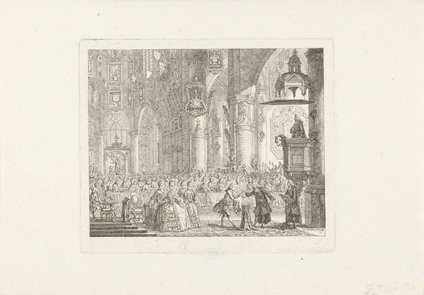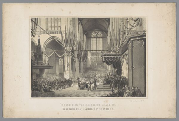 This is a page from an illustrated magazine, made in 1874 by Frédéric Théodore Lix, depicting a ceremony with King Willem III in the Nieuwe Kerk in Amsterdam. The image is a wood engraving. In this process, the artist uses specialized tools to carve an image into the end grain of a block of wood, which is much harder than the side grain used for woodcuts. This allows for finer detail and more intricate designs. Look closely at the details of the architecture and the figures in the crowd. The density of the marks creates a sense of depth and texture, almost like a photograph. Wood engraving was a popular method for reproducing images in books and magazines during the 19th century. It was a skilled and labor-intensive process, often involving teams of engravers working to tight deadlines. This print offers a fascinating glimpse into the relationship between art, industry, and the dissemination of information in the modern era.