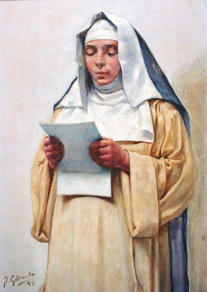 Curator: Immediately, I'm struck by how intimate this painting feels. Editor: That’s Jules Breton’s 1854 painting, "Young Woman Praying in Church". It offers an interesting glimpse into 19th-century depictions of piety and femininity. We can explore it together from the perspective of devotional iconography, considering both its surface appearance and underlying cultural narratives. Curator: There is something really tender about the way she is posed; seated demurely in the simple chair with her hands clasped, head covered in the way that implies humility. This visual vocabulary evokes powerful cultural connotations around gender and faith, particularly when thinking of 19th century ideas about the roles women were expected to occupy. It is fascinating how images become culturally weighted with this specific symbolism over time. Editor: I think there's also a subtle tension here, too. Note her gaze - she isn't looking downwards in expected subservience. Her head is slightly upturned and to the right, conveying perhaps a desire or longing that the space for women and agency at the time were not receptive to or accepting of. It is important to note that visual piety of the era existed not in a vacuum, but in a cultural system which constrained women politically and socially. How does that read through in a 19th century piece like this? Curator: Interesting point. The headscarf itself can function as a symbol, both of piety and of the limited freedoms imposed on women of the time. Also, it functions in this case almost like a halo or even some sort of aspirational, near-sacred vision of female selflessness. How that operates within larger sociopolitical trends and cultural expectations is an ongoing conversation. The painting, with its subtle gestures and cues, contributes to an ongoing visual and social narrative. Editor: I agree that this contributes to a narrative, though I also can’t ignore that the woman’s upturned gaze suggests some hope despite such impositions. Breton provides a symbol which represents cultural expectations of piety and submission while at the same time implying some tension and desire that hints at resistance or dissatisfaction. This could indicate changing sentiments around identity and power during the 1850s. Curator: Thank you. Analyzing art through the lens of its historical symbolism opens us up to so much dialogue with not only the artist’s intentions, but society itself. Editor: Yes, indeed. This exchange reminds us how powerfully these dialogues through art expand the potential for understanding ourselves and the worlds around us.