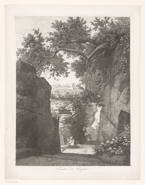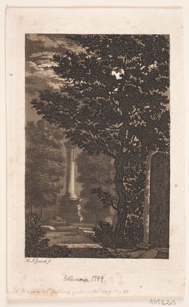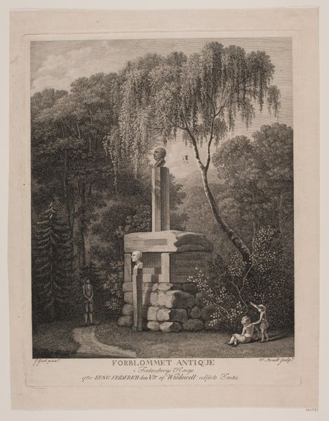 This print, “Forblommet antik i Fredensborg Have”, was made by Frederik Ludvig Bradt, and captures a scene in Fredensborg’s gardens. It’s a delicate work, created using engraving - a process where lines are incised into a metal plate, which is then inked and printed. Notice how Bradt uses the crisp lines of the engraving to create a sense of depth and texture, from the smooth stone of the busts to the tangled foliage of the trees. This precise process, requiring skill and time, contrasts with the apparent spontaneity of nature. The image invites reflection on the relationship between nature, culture, and representation. Engraving was a key technology for disseminating images at this time, making art and ideas accessible to a wider audience. Bradt's print, with its classical allusions and idealized landscape, speaks to the values of the Enlightenment, but also to the labor involved in shaping both the physical landscape of the garden, and its artistic representation. It underscores how prints like these played a crucial role in shaping cultural tastes and perceptions.