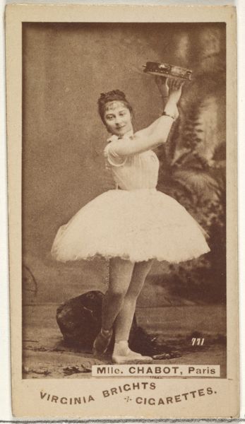 Editor: This is a fascinating photographic print: "Mlle. Carmen, Paris," dating from between 1885 and 1891, part of the "Actors and Actresses" series. It looks like it was originally an advertisement for Virginia Brights Cigarettes. It's striking how posed and staged it feels. What do you see in this piece, especially considering its initial purpose? Curator: It's important to consider the socio-economic context here. Tobacco cards like this one exploded in popularity during this era, reflecting the burgeoning consumer culture and the rise of mass media. These cards weren't just advertisements; they were collectible objects. Think about who these images targeted. Who was consuming cigarettes and these promotional items? What kind of fantasy or aspirational lifestyle did Mlle. Carmen represent to them? Editor: So it’s about selling a lifestyle as much as cigarettes. Mlle. Carmen, a performer, represents a world of glamour and excitement… but also perhaps reinforces certain expectations of women in the public sphere at that time? Curator: Precisely. These images are never neutral. Consider the performative aspect here – Mlle. Carmen isn’t simply posing; she's enacting a role, which reflects how women entertainers were often seen. These images, disseminated widely, helped shape public perceptions of female performers and, by extension, women generally. It's worthwhile investigating more closely the societal values promoted through popular media like cigarette cards. Editor: That’s really interesting, the photograph operates on so many levels at once. What’s been really helpful is thinking about the way the artwork functions within a larger social structure and the possible intended consumer of it. Curator: Absolutely. The art isn't just on the card; it’s in the exchange between the object, the company producing the artwork, and those receiving the image within that cultural climate.
