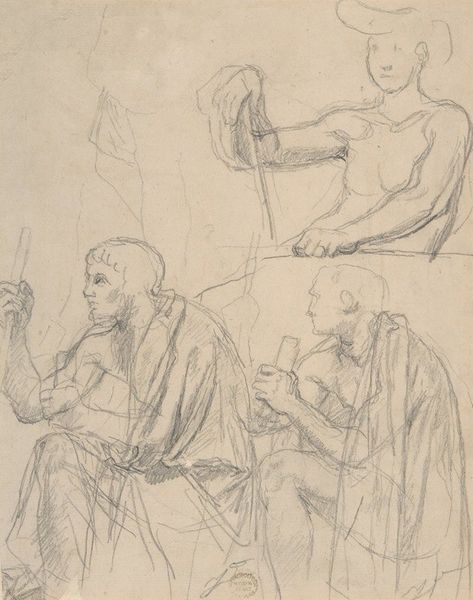 This drawing, depicting two male figures in classical costume, was rendered anonymously with pen and ink on paper. The rapid, freehand style suggests a preparatory sketch rather than a finished work. The artist's choice of materials – simple and readily available – speaks to the drawing's function as a working document. The pen and ink allow for quick, fluid lines, capturing the dynamic poses and drapery of the figures. The paper support, likely inexpensive, bears the marks of its handling, with creases and slight imperfections that add to its informal character. While the drawing may not be a polished masterpiece, it offers a glimpse into the creative process, highlighting the importance of material exploration and the skilled hand in translating ideas into visual form. It reminds us that even the simplest of materials, when combined with skill and intention, can yield compelling results.