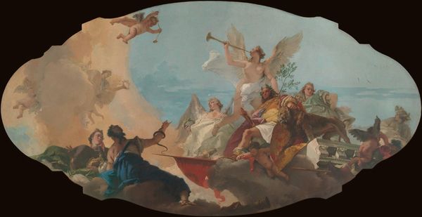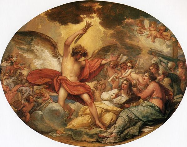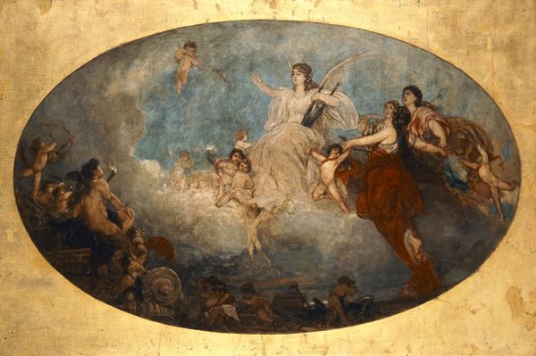 Editor: Isidore Pils's oil painting, "Minerve combattant la Force brutale devant l’Olympe réuni," completed in 1872, depicts a vivid scene of gods and mythological figures. What strikes me immediately is the strong contrast between the serene gathering on one side and the violent struggle on the other. How do you interpret this visual juxtaposition? Curator: The contrast is indeed powerful, highlighting a core theme. We see Minerva, or Athena, as the embodiment of reason and civilization, actively opposing "brute force." The iconography suggests a broader struggle between intellect and primal instinct. Consider the symbolic weight: Athena, helmeted and armed, confronts a chaotic, bestial energy. On the opposite side, we have a collection of Olympian figures representing harmony and order, perhaps indicating the ideals threatened by brute force. Do you notice the gaze of the central figures? Editor: Now that you mention it, it's clear! The gaze of the figures is striking: Minerva’s direct, focused stare is completely different from the seeming indifference of the other gods. Curator: Exactly. It signals her active role as defender, unlike the passive observation of the Olympians. In art of this period, this symbolizes more than just physical combat; it’s the defense of enlightened principles. The question for viewers becomes: what is the nature of brute force? And what enlightened principles are worth fighting for? It could easily symbolize not only a fight but also progress and its costs. Editor: So it’s not just a depiction of a mythological scene, but a representation of societal ideals and anxieties of the time. I never thought of the composition in those terms before. Curator: Art provides this lens through which we revisit culture and its values, which helps to clarify those that we hold most dear, as well as those that perhaps were harmful, too. Editor: It is fascinating to unpack such complex layers of meaning within a single image. Thank you for illuminating this work!