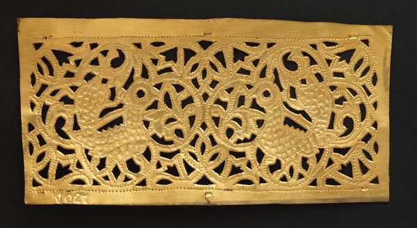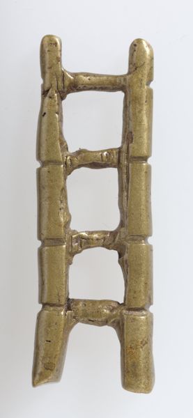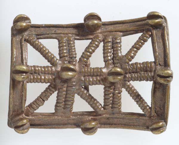 This brass goldweight, shaped like a shield, was made by the Akan people. Its small size belies a sophisticated interplay of form and function. Notice how the rigid geometry of the rectangular frame is softened by the rounded nodes at each corner, creating a balance between structure and fluidity. The interior lattice-work, with its radiating and parallel lines, offers a study in contrasts. The lines give a sense of both containment and expansion, protection and openness. Consider how the artist has deployed a limited vocabulary of shapes and lines to create a complex visual statement. It invites a semiotic reading, where the "shield" form signifies not just defense but also status and cultural identity within the Akan society. The linear elements might be seen as encoding principles of community, connection, and hierarchy. It is an object with an ongoing potential for meaning.