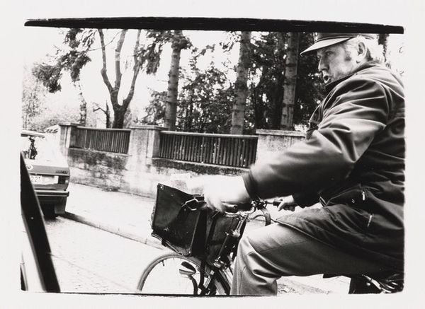 Curator: This is Jerome Liebling's "Málaga, Spain," a gelatin-silver print taken in 1966. It captures a moment of everyday life with stark realism. Editor: My initial impression is one of poignant stillness. There's a powerful gravity in the girl's expression, framed by the mundane background, which is surprisingly soothing. Curator: It’s interesting you mention the stillness. Liebling's work often explores the dichotomy between the static and the dynamic within urban life, wouldn't you agree? Note the stationary bike behind the figure; it offers a great example of an implied movement with the woman appearing anchored in that moment. Editor: Absolutely. And let’s not forget the image of the toy bull. Bulls appear so prominently in Iberian art, of course, especially considering their relationship with the violent pageantry of bullfighting. This single image manages to encapsulate elements of childhood innocence alongside a harsher cultural symbol. Curator: I see your point. Placing that reading of the bull within the context of Franco's Spain, its imagery can even read like a tacit resistance. Editor: It becomes almost an ideological counterpoint—an invocation of cultural identity amidst a period of suppressed liberties. Curator: The composition itself leads one back to the cultural undercurrents, specifically how the girl, positioned centrally, seems to embody this tension between tradition and the socio-political constraints. Her unwavering gaze confronts the viewer head-on. Editor: Yes, the lack of affect in her eyes is remarkable; like she's both present and distant. It elevates the photograph beyond a mere street scene to a timeless depiction of resilience. What is that resilience preserving for the next generations, one might ask? Curator: It encourages contemplation of how personal narratives become entwined with broader historical trajectories. Editor: Exactly. It gives that single shot reverberating depth beyond what it depicts materially. Curator: Liebling offers a lens through which we can reflect upon a society undergoing profound change, while quietly, almost privately, celebrating what lasts beyond those transformations. Editor: In closing, for me, this seemingly straightforward image is an emotionally-dense visual poem.