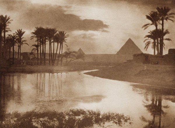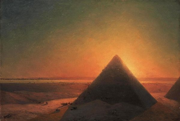 Editor: So here we have Vasily Polenov’s "Great Pyramids of Cheops and Chephren", painted in 1899 using oil paint. I am struck by how softly he renders these monumental forms. It's almost dreamlike, despite the subject. What aspects of this piece particularly grab your attention? Curator: Immediately, it’s the handling of light and color. Note the subtle gradations within the pyramids themselves. Polenov captures the light not as a uniform wash, but as something fractured, shifting across the planes. Observe also how the reflected light in the water is not a simple mirror image, but distorted, broken into distinct strokes. Does this suggest anything to you about Polenov's understanding of form? Editor: It makes me think he's not just aiming for a photographic likeness, but something more interpretive. Is that fair to say? Curator: Precisely. It’s a structured interpretation. He seems preoccupied with how light alters the geometry, softening the severity of those hard, edged shapes. The textural application of paint further reinforces this. Notice the visible brushstrokes—they serve not merely to represent, but to create a dynamic surface. Do you find that this dynamism contradicts or enhances the monumental stillness typically associated with the pyramids? Editor: I think it enhances it, strangely enough. The energy in the brushstrokes makes them feel even more solid, as if he’s really grappling with their weight and presence. Curator: Yes. The formal tension lies in this interplay—between the immutable geometry of the pyramids and the ephemeral qualities of light, colour, and texture. It's a dialogue, not a simple transcription. What do you take away from this visual dialogue? Editor: I'm beginning to appreciate how a seemingly straightforward landscape painting can actually be a complex investigation of form and light, rather than just a pretty picture. Curator: Indeed. Polenov's pyramids offer an eloquent lesson in the power of observation and structured mark-making.