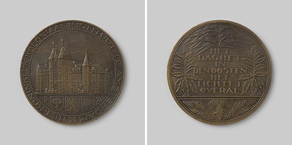 Editor: So, here we have "Commissie voor Aangehouden Lading 1940," a bronze relief from 1940 by Johannes Cornelis Wienecke. It looks almost like a medieval coin or seal, and there's this tension between the industrial scene and the classical imagery that makes me wonder about its message. How do you interpret this work? Curator: The symbolism here is incredibly dense. Consider the trident, usually an attribute of Neptune, the god of the sea, but here it rises menacingly from turbulent waters through the center of a harbor scene in full swing. The “Commission for Detained Cargo” of the title is referenced in a very indirect manner, so how does it sit within the imagery, do you think? Editor: Perhaps the trident suggests the commission’s power to control the seas and, therefore, trade? Like they are gripping trade itself? Curator: Precisely. Wienecke seems to be employing classical symbols to represent contemporary authority and perhaps even maritime dominion. Notice the hand grasping the trident, is it a God’s? Or just that of a regular human, an emblem of state power exerted on the waves? Editor: It doesn’t look godly, more like… armored, strong but mortal. It's quite a contrast, that hand and trident versus the modernity around it, the cranes and cargo. Curator: The juxtaposition is key. This tension between ancient symbols and the modern world really highlights a desire to establish continuity. To show power, timelessness, perhaps legitimacy during a very tumultuous time. Do you see the wave patterns, what might they represent to you? Editor: Maybe the chaotic and uncontrolled aspects of the war impacting maritime trade, in contrast to the ordered port? I didn’t catch that at first! Curator: These historical echoes within the symbolism offer a powerful lens to view the past and the present simultaneously. Editor: This really demonstrates how symbols can create complex and enduring narratives. I'll never look at a trident the same way.