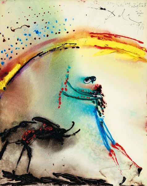 This is Salvador Dalí’s watercolor and gouache painting, Alice au pays des merveilles, and, wow, it’s a trip! The way Dalí layers translucent washes with these assertive, almost cartoonish marks is so playful. You can really sense him working through the image, letting the paint do its thing. Looking closely, I love how the orange and blue bleed together at the base, creating this fiery, dreamlike space. And then there's this mushroom shape in the foreground, outlined in a thick, almost gloppy blue—it grounds the whole composition. It's interesting, right? How he balances control and chaos, the fluid and the defined. Dalí’s was deeply influenced by the Surrealist movement, interested in automatism: the release of unconscious thoughts and feelings. It makes me think of Philip Guston, actually, another artist who embraced a kind of raw, honest mark-making to explore the depths of the imagination. Ultimately, it's a reminder that art is a process of discovery, where meaning emerges through the act of making itself.