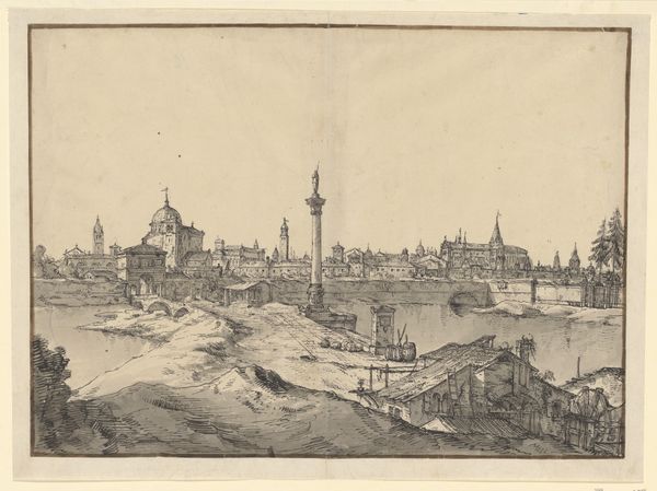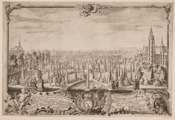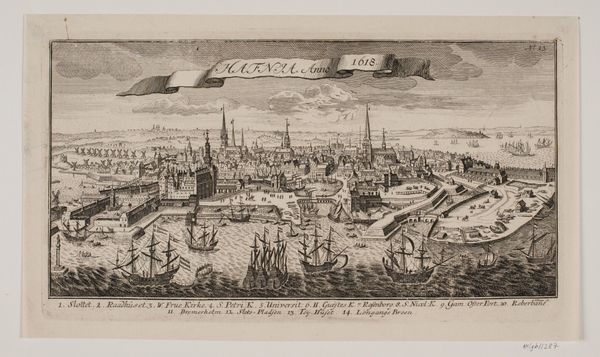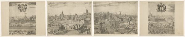 Editor: So, this is "View of Middelburg (third part)" by François Schillemans, created sometime between 1616 and 1679. It's a Dutch Golden Age etching, a cityscape showing the harbor and city. It strikes me as incredibly detailed; almost overwhelming! What stands out to you when you look at this piece? Curator: The etching medium lends a graphic clarity that invites us to delve into the layered meanings here. Consider the sheer density of ships. What do they signify beyond mere transportation? Think of them as symbols of ambition, exploration, and the projection of power and influence on a global scale. Middelburg was a key hub of the Dutch East India Company; that informs the images chosen and how they are deployed. Editor: So the ships aren't just ships, they represent something larger? Curator: Precisely. Visual symbols like ships, windmills, and church towers communicate collective beliefs, historical events, and shared ideals of the Dutch Golden Age. For example, windmills represent a mastery of nature, and churches refer to faith and order. Each element resonates with established cultural values and ideals, giving the image depth. Do you notice any emotional effect from these images? Editor: I guess there’s a confidence or optimism. Middelburg is portrayed as this bustling center, ready to take on the world. I hadn’t really considered all the different layers of meaning before! Curator: And by decoding them, we discover more about this historic society and what its inhabitants hoped to achieve. Cultural memory is a powerful current indeed! Editor: I’ll certainly be looking at landscapes with a fresh perspective from now on!
