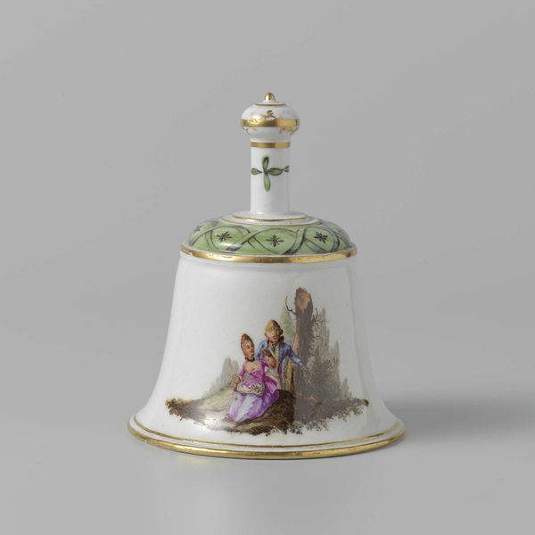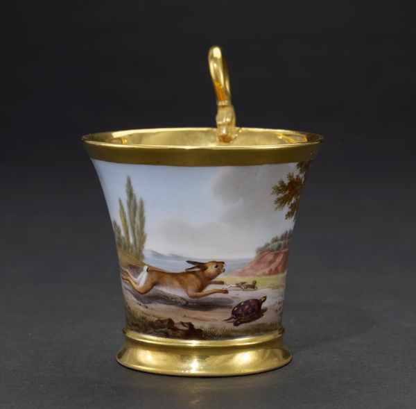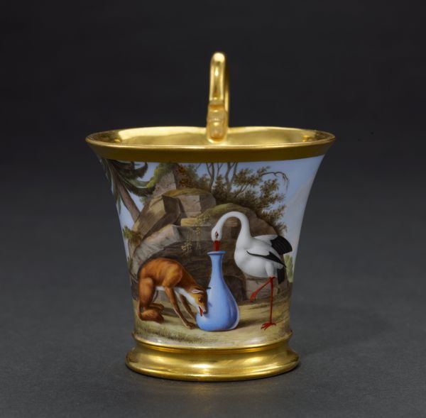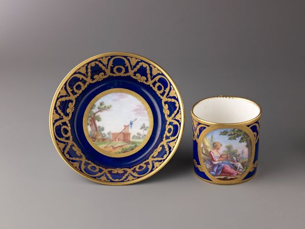 This covered cup and saucer, made by Anton Kothgasser, reflects the cultural and artistic milieu of early 19th-century Vienna. Kothgasser, working in the shadow of the Habsburg Empire, painted delicate neoclassical scenes onto glass and porcelain, catering to the tastes of the Viennese elite. The cup and saucer are adorned with scenes that evoke classical mythology and idealized landscapes. A man kneels before an alter, begging for salvation, while a woman offers a basket filled with flowers, as an angel oversees the whole scene. The imagery suggests themes of devotion and perhaps redemption, reflecting the conservative yet spiritual values of the time. The choice of porcelain as a medium speaks to the era's fascination with luxury and refinement, but it also subtly hints at the power dynamics of a society where such exquisite objects were accessible only to a privileged few. Kothgasser's covered cup and saucer encapsulates the intersection of artistry, social status, and cultural ideals in early 19th-century Vienna.