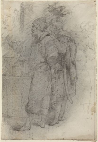 Curator: Alphonse Legros' pencil drawing, "The Departure", created in 1905, presents a scene of quiet desolation. What springs to mind when you look at this? Editor: The first word that pops into my head is "wistful." There’s a stark simplicity, almost a melancholic stillness about the piece that really grabs me. The soft shades of pencil only enhance the solemnity of the scene. It reminds me of those old family photos where everyone looked like they knew something I didn't. Curator: It is a genre-painting rendered in impressionistic style, indeed. The three figures appear burdened. The woman on the left seems to be shielding her face, the man in the middle is hunched over as if carrying a great weight, and even the woman on the right, carrying a basket, seems bowed. Do these figures speak to broader archetypes to you? Editor: Absolutely, this echoes centuries of visual symbols relating to expulsion or displacement. That gesture of covering the face—it speaks volumes. It is seen across cultures as a representation of grief, shame, or the unbearable nature of one's circumstances. The man, hunched and burdened, brings to mind the imagery of Atlas carrying the world on his shoulders. It almost makes you wonder about what specific stories they might all represent? Are we observing personal or a general symbol of the struggles people endure? Curator: I agree; I believe Legros masterfully captured that universality. And, look, although this appears at first a study in realism, the style of shading, especially the foliage in the background, whispers of Impressionism. Editor: Exactly! It softens the potential harshness, allowing us to feel the human element more keenly. Those smudges are like a blurry memory. There's a raw emotion embedded in the very materials and strokes he has chosen here. Curator: I appreciate your calling out the way those choices inform this piece. The deliberate rendering suggests it could act as an open text: there's the feeling of being forced from a homeland, or a severance from family, but it's presented in a way that remains ambiguous. Editor: It gives the piece staying power. Even without knowing the exact historical context, its themes remain incredibly potent and recognizable. Like those symbols—shame, hardship, and perseverance— etched so strongly into human consciousness, resurfacing time and time again through the ages. Curator: I find myself dwelling on the universality that lies at the heart of this picture, beyond the specific. Legros makes this departure so potent through his masterful employment of understated form and relatable archetypes. Editor: A poignant piece for sure, Legros leaves us with the undeniable sense that while departures are often shrouded in shadow, the capacity for hope remains.