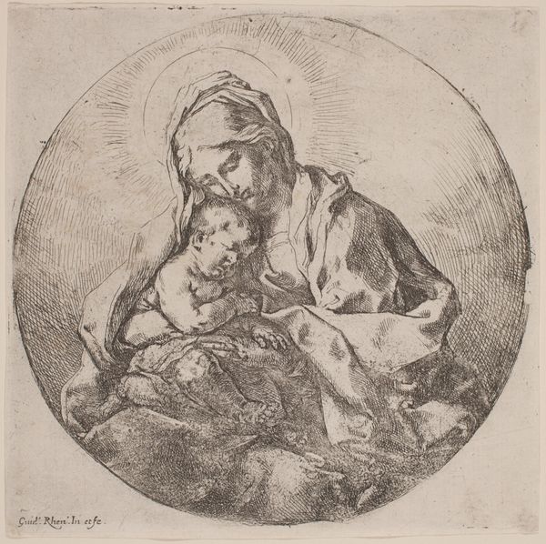 This print of The Virgin holding the infant Christ was made with etching, a printmaking technique that democratized image production in its time. An etcher covers a metal plate with a waxy ground, then draws through it with a needle to expose the metal. The plate is then immersed in acid, which bites into the exposed lines, creating grooves. Ink is applied to the plate, filling these grooves, and the surface is wiped clean. Finally, the plate is pressed onto paper, transferring the image. Look closely and you will see that the entire image is built from these etched lines, which create a delicate contrast to the blank paper. The ease of etching, compared to older printmaking methods, allowed for a greater distribution of imagery and a thriving market for reproductive prints. This particular print copies an image by the famous painter Guido Reni. Though anonymous, the etcher skillfully translated Reni's composition into a readily available format, inviting wider appreciation of his artistic vision. Remember, every artwork is a product of materials, making, and social context – factors that profoundly shape its meaning.
