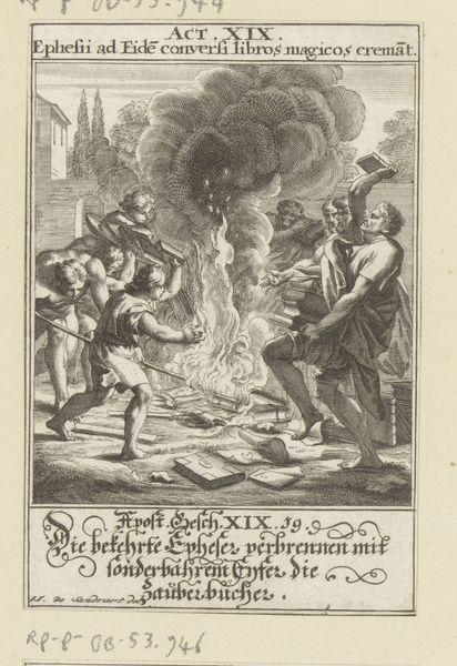 Curator: This engraving from 1572-1573 by Giovanni Battista Fontana, currently held here at the Rijksmuseum, is titled "Romulus offers to the god Hercules". Editor: My first impression? Stark and precise. It feels like stepping into a meticulously staged scene. The figures seem caught between the earthly and something grander, a feeling underscored by the towering fire. Curator: Fontana’s mastery with line is definitely on display here, a hallmark of classical realism that lends the work a certain gravitas. He's working within a strong tradition of Italian Renaissance printmaking, but he brings his own flair to the narrative. It is from a set, focused on Roman history, of which this is plate number ten. Editor: I’m really drawn to the interplay between light and shadow. The dark, precise lines of the engraving technique highlight the musculature of Hercules, rendering his figure with a striking three-dimensionality that sets him apart as both a figure, and a concept in the space. He towers at the center-left. Curator: Yes, Hercules is stoic on that pedestal, as Romulus and his entourage cluster on the right before a great blazing altar, deep in ceremony, in supplication. It strikes me as somewhat bleak; I’m pondering what Fontana might have intended by positioning Romulus, one of Rome’s legendary founders, against the backdrop of divine demand. He does seem burdened. Editor: Absolutely. There's a strong contrast between the very linear, almost architectural precision, and the somewhat amorphous forms created by the flame. Semiotically, that flame represents more than sacrificial ritual; it signifies a transition, purification maybe, but it also consumes. And Hercules, with his back to us on his podium, acts almost as an avatar of the viewer. He too observes and does not intervene, implicated. Curator: Thinking about figuration and narrative in art, pieces like this offered lessons for a world that valued history painting. To think, this small print likely circulated widely, planting its epic imagery into the minds of many. Editor: What’s left with me, in the end, is Fontana’s technical command in conveying a historical weight, yet framing it through his subjective vision of what that story signifies.