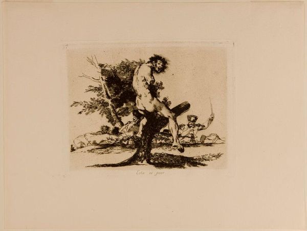 Editor: This is Karl Bodmer's "Two Bears Climbing a Tree." I'm struck by how detailed it is for a print. What can you tell me about its place in art history? Curator: Bodmer, a European artist, created this during a time of intense interest in the American West. Prints like these shaped European perceptions of the 'untamed' wilderness. Consider the narrative—are the bears symbols of nature's power, or are they being 'documented' for scientific consumption? Editor: So, it's more than just a picture of bears; it's about how Europeans viewed the American landscape? Curator: Precisely. It reflects the complex relationship between exploration, scientific inquiry, and the romanticized view of the 'wild' that fueled expansionist agendas. The image's circulation also created new audiences for such depictions. Editor: That's a lot to consider beyond just the bears themselves. Curator: Indeed, it encourages us to think about the power of images in shaping public understanding and justifying historical actions.