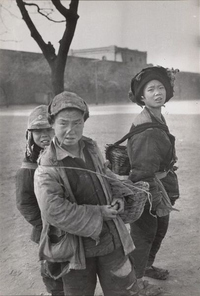 Curator: This striking image, taken in 1943 by Ansel Adams, is titled "Female interns practicing calisthenics at Manzanar internment camp." It's a gelatin-silver print. My first impression? The vast expanse of sky seems almost mocking, a freedom juxtaposed with the stark reality of their confinement. Editor: Yes, and note how the women are all wearing these remarkably well-made, knitted cardigans. It gives them a collective identity, like a uniform of sorts. What kind of fibers do you think would have been available at the time in that location? I’m wondering about supply chains and how these materials got there, you know? Curator: That's a compelling point. Adams was commissioned by the US government to document life at Manzanar, aiming to show normalcy amidst injustice. However, these controlled images risk normalizing a deeply unethical situation: the incarceration of Japanese Americans. Their shared labor in creating their own textiles feels like a muted act of defiance, or perhaps, self-preservation. Editor: Muted is the word. These women, linked through a repetitive, almost militaristic physical activity, reveal how even in captivity, humans attempt to assert control, shape their surroundings. The repetition in form, that mirrored line of arms—it reminds me of factory work. It’s labour, right? It keeps them functioning. Keeps the community in motion. Curator: It is functional. This physical exercise was intended to maintain some form of health, of social cohesion, in the face of devastating loss of liberty, community, identity. However, Adams' role is itself problematic; his perspective, framed and funded by the very system that imprisoned them. Editor: Absolutely. There's a real tension between the objective process of photography and the subjective experience of being incarcerated. Consider the resources needed even to produce a "simple" black and white photograph. Someone was making and selling the emulsion, processing the negatives, making and trading the fixer and stop bath... All for this singular photograph taken by an external artist who profits off of his own subjective choices in depicting the sitters in that moment. Curator: Precisely. This photograph prompts a complex, ethically fraught conversation. The seemingly simple act of documenting becomes deeply intertwined with questions of power, representation, and the very fabric of historical memory. Editor: Exactly. By understanding these tensions we get closer to a genuine encounter with this uncomfortable moment and how it's been portrayed to the world. Thank you for your perspective.