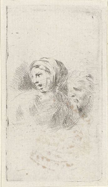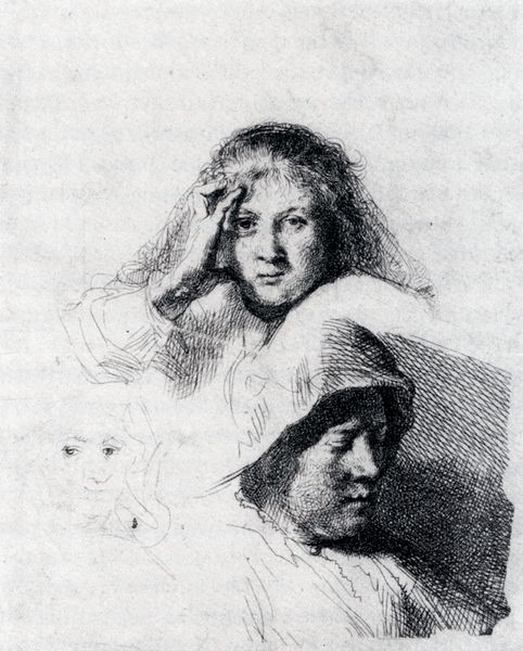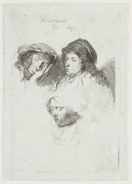 Editor: Here we have Rembrandt van Rijn's "Three Heads of Women, one lightly etched," created around 1637 and held at the Rijksmuseum. The delicacy of the etching creates a really intimate feeling, almost like glimpsing a private sketchbook page. What stands out to you in terms of the formal qualities of this print? Curator: Indeed. Focusing on the visual elements, consider the strategic deployment of line. Rembrandt masterfully uses etching to vary line weight and density. The central figure, caught in thought, displays a dynamic contrast—observe how light plays across her face, achieved through varied line density. Consider the function of the 'lightly etched' face. Editor: I see it now. It's like a study in contrast, almost incomplete, compared to the darker, more defined figure below. What does that juxtaposition do for the overall composition? Curator: Precisely. That intentional incompleteness disrupts any clear hierarchy. The varying degrees of finish deny the viewer a single focal point. The surface is activated, a semiotic play. Now, what about the arrangement of the heads themselves? Editor: They're arranged almost haphazardly, not aligned or balanced in a conventional way. This throws the image off balance... creates an innovative formal relationship that asks viewers to decide the relationship themselves. Curator: A crucial insight! The structural imbalance fosters visual tension, avoiding conventional harmony, encouraging close scrutiny of individual forms and their unconventional interrelation. Are you detecting symbolic implications stemming from his aesthetic approach? Editor: Possibly the exploration of diverse emotional states... achieved less through overt expressions, and more through the variance in the artwork's graphical detail? The viewer has to interpret. Curator: Your perception is most welcome. It beautifully encapsulates how an artwork’s compositional strategies can effectively communicate through pictorial semiotics. Editor: I never would have thought that much could be said by just lines in specific orientations; thanks for your insights!