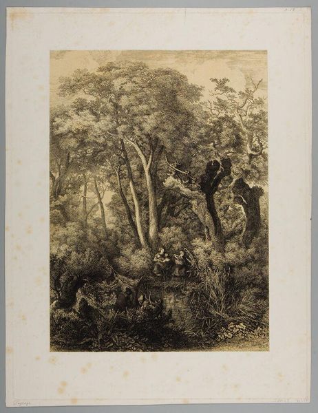Editor: This is "House under the Trees" by Domenico Quaglio. It's a very intricate print, but the dense layering of marks gives it a somewhat ominous mood. What compositional elements stand out to you? Curator: The dramatic contrast between light and shadow creates a compelling visual tension. Note how Quaglio uses varied line weights and densities to define form and spatial relationships. The strategic placement of the house, partially obscured by the trees, also guides the viewer's eye. Editor: So, it's less about the subject, and more about how the lines create shape and depth? Curator: Precisely. Consider the texture created by the repetitive marks, which function to represent both the foliage and the atmospheric conditions. It's a masterful study in tone and texture. Editor: I see it now, it's like the trees are just an excuse to play with shadow. Thanks for pointing that out. Curator: Indeed, and that is the true beauty of the piece.