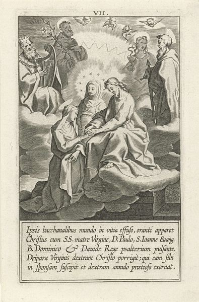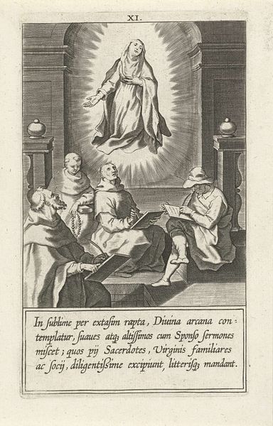 Editor: This print, titled "Catharina ontvangt de communie van Christus," was created in 1603 by Cornelis Galle I and is held at the Rijksmuseum. The fine lines of the engraving really draw me in; it almost feels like a sacred scene captured with great detail. What stands out to you when you look at it? Curator: What immediately commands attention is the interplay of light and shadow, carefully delineated by the artist's skillful employment of line. Notice how the engraver uses hatching and cross-hatching to articulate form and create tonal gradations, moving the eye across the composition, from the earthly realm occupied by the priest and attendants to the celestial apparition of Christ bestowing communion. The composition achieves balance using these precise graphic articulations. Editor: So the technical elements are crucial to how we read this piece? Curator: Precisely. The linear precision and detailed rendering typical of engraving are paramount here, reflecting not merely a narrative but also an exercise in the very properties of line as a formal device. Galle's technique shapes our viewing experience, subtly guiding our interpretations. Note that the varying densities create emphasis. How does this affect the subjects depicted in the artwork? Editor: It spotlights Christ and Catharina; they are indeed more prominent. Curator: A great insight, highlighting how technique drives the overall aesthetic. In other words, this is where content aligns with formal elements and that determines our aesthetic reaction. Editor: So focusing on the technique helps reveal its significance beyond just religious illustration, adding aesthetic intent to the spiritual narrative. Curator: Precisely. That the meticulous structure emphasizes the visual dynamic. The work beautifully reflects form and content, thus elevating both.