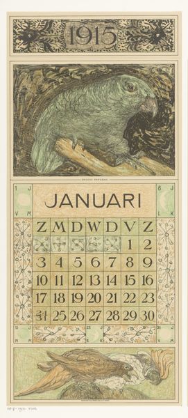 Curator: I am drawn to the stark, graphic nature of this print. Its dominant colors are very subdued; it projects a very peaceful feeling, like looking at a winter scene under an overcast sky. Editor: This is "Kalenderblad januari met kraaiende haan" by Theo van Hoytema, created in 1915. The artwork, which translates to "January Calendar Sheet with Crowing Rooster," is held at the Rijksmuseum. Hoytema was a known illustrator, graphic artist, and lithographer; this work stands as a beautiful example of the art nouveau style applied to everyday ephemera. Curator: The composition is wonderfully balanced. The rooster is centrally placed, confidently straddling the picture plane with those lovely sweeping lines that suggests the motion of it opening its beak. The calendar section below and the illustrations below add so much richness in detail and character. Editor: What interests me is the calendar’s design as a product meant for a specific audience at a certain time. Think about the social role a calendar plays. It serves as both a marker of time's passage and a reminder of the activities around us. The choice of a crowing rooster and nesting fowl as primary imagery are a perfect reflection of agricultural life and rural societies—a call to action, as well as an illustration of simple peace in slumbering through winter. The botanical frame only adds to this sensation of connecting to the landscape in that way. Curator: And there is that beautiful typeface; it provides a sort of official formality but with softer letter forms, almost rounded and softened. And this sense of order almost reminds me of the organizational impulses so popular around this period. I like how it provides not only the days of the week, but charming sketches for each. Editor: That blend of functionality and artistry speaks volumes about the intent to integrate beauty into everyday life. Also, let's note Hoytema’s choice of using prints during a period of industrial expansion in Europe. It speaks to how artists attempted to make artwork more widely accessible at a time when social hierarchies could influence access to art and artwork ownership. Curator: Overall, its simple color scheme paired with strong organic shapes, makes the artwork feel both nostalgic and timeless. Editor: Absolutely; it's a captivating lens into a time where art was seamlessly woven into the fabric of daily existence and into public culture.