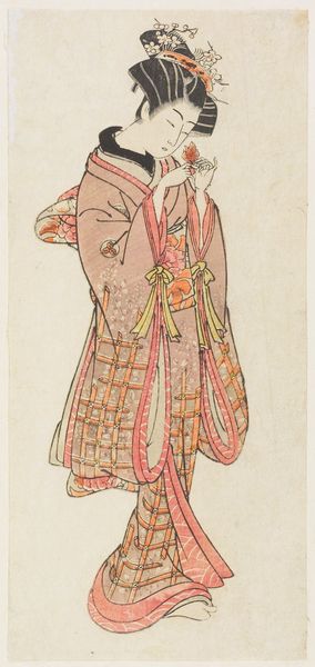 Okumura Masanobu created this woodblock print, Yaoya Oshichi holding a battledore paddle, in Japan during the 18th century. The image is dominated by the figure of a woman in an elaborate kimono, rendered through detailed patterning and a muted palette of yellows, pinks, and blacks. The flatness of the print emphasizes the intricate designs of her garment, drawing our eye across the surface. This visual emphasis on design invites us to consider the semiotic elements at play. The kimono, with its combination of geometric and floral motifs, becomes a site of cultural coding. The flatness of the composition, typical of ukiyo-e prints, disrupts traditional Western notions of depth and perspective, challenging fixed ways of seeing. Ultimately, the print’s formal qualities extend beyond mere aesthetics. The visual interplay between surface and depth, flatness and ornamentation, reflects a broader engagement with cultural values and artistic conventions. The artwork invites us to interpret its intricate patterns as an expression of cultural identity, and to consider the ways in which these visual signs communicate meaning within a specific historical and social context.
