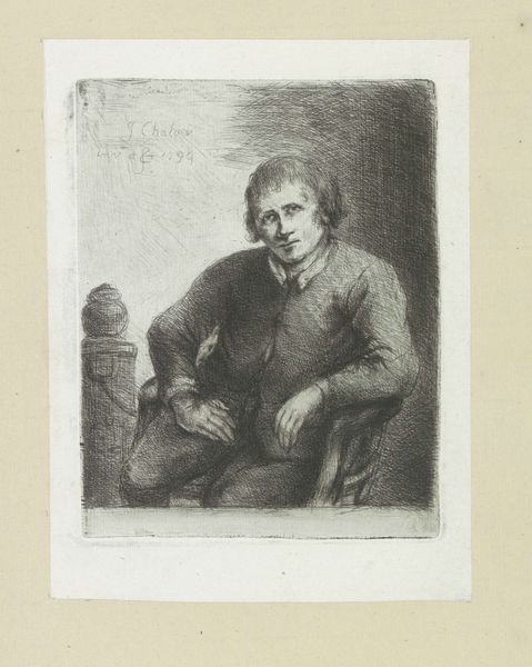 Curator: I find myself quite intrigued by this pencil drawing, titled "Portret van de acteur Jolly in de rol van kunstenaar Lantara," created around 1810-1825. The piece resides here at the Rijksmuseum, and the context surrounding its creation is just fascinating. Editor: My first thought? The energy in this sketch! It's incredibly dynamic for what appears to be a rather simple portrait. Look at the rapid strokes defining his hair, the almost mocking glint in his eye. Curator: Precisely! The caricature presents the actor Jolly embodying the artist Lantara, known for his seascapes and association with the informal artistic group "Société du Caveau." This drawing then exists within circles of actors, artists, and social satire prominent during the time of Baron Dominique Vivant Denon. It speaks volumes about artistic communities. Editor: Absolutely. From a formal standpoint, consider how the artist captures light and shadow with such economical lines. The cross-hatching to define the figure's volume contrasts wonderfully with the more delicate rendering of the objects on the table, creating depth and highlighting key elements of the composition. Curator: The placement of props absolutely underlines Lantara’s artistic identity while hinting at a specific social reality for artists at the time. Is it artistic vision being fueled, or romanticized drunken debauchery? Either way, this challenges ideas about artistic labor, genius, and even authenticity. It's quite pointed. Editor: It also adds to the psychological intensity. I read so much in the gaze itself, the one raised eyebrow. What I find impressive is how all these artistic and intellectual meanings rely on very spare details, each placed intentionally in a specific corner or layer. Curator: The pencil allows for those expressive yet restrained qualities, which serve a precise communicative purpose during this rise of a popularized press and graphic satire. It is truly a remarkable depiction when held in relation to cultural production at that time. Editor: I agree, it feels both personal and indicative of larger social trends. Ultimately, its aesthetic appeal arises precisely from its technical virtuosity married to its poignant social commentary.