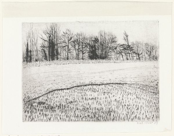 Curator: Ah, "Lake Shore with Reeds" from 1912 by Eero Järnefelt, crafted with ink and colored pencils. A deceptively simple scene. What's your first impression? Editor: It feels like a whispered secret. The somber colors evoke a certain melancholy. I see these sentinel trees standing guard at the edge of the water… are they keeping something in, or keeping something out? Curator: Perhaps they're witnesses. Järnefelt was deeply inspired by the Finnish landscape, imbuing his work with its stoic beauty. Notice how he uses those earthy browns and blues, it’s like the colors are holding their breath. What symbolism do you read within the skeletal forms of these bare trees? Editor: To me, the bare branches against the vast, open lake are about resilience and adaptability. There’s vulnerability in their nakedness, but also strength. They’re survivors. That, and the reeds symbolize the capacity to flourish under harsh conditions, adapting and thriving even when life isn't always so easy, I see them as symbols of memory and folklore—a reminder of nature’s enduring wisdom. Curator: Indeed. Järnefelt’s commitment to capturing the nuances of nature mirrors the Kalevala, our national epic, in its emphasis on the spiritual essence of the natural world. And do you notice the lack of sky? The water stretches horizontally across the page, and yet all the visual focus is on the terrestrial elements of the shoreline itself. Editor: Precisely! By omitting the sky, Järnefelt seems to confine our gaze, intensifying our focus on the immediate. It evokes a feeling of quiet intimacy. Curator: There's such a sense of calm, even isolation, here. It resonates so strongly, especially in our current world, like a reminder of simpler times, of the beauty of stillness. Editor: And of nature's capacity to remind us of our place in it, the grander, enduring scope of nature and time itself. Curator: Ultimately, this work is an invitation. To find stillness and strength, even when the winds of life howl around us. Editor: A beautiful perspective; I hadn't thought of that, I must admit. Well, until our next contemplative landscape, perhaps?
