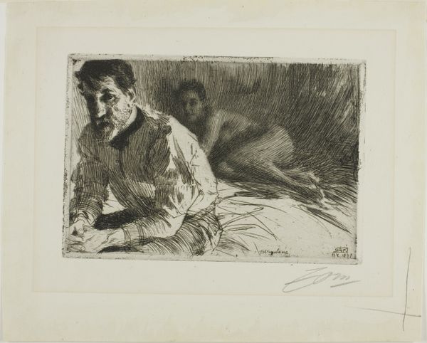 Curator: Lovis Corinth, born in 1858, made this plate called "Death and the Youth" which is part of his "Dance of Death" portfolio. Editor: It's striking, isn't it? The raw energy in the etching—almost feverish, like a half-remembered dream. The youth seems to embrace death. Curator: Indeed. Corinth's command of line and shadow creates a stark contrast. The youth's smooth skin, juxtaposed against the skull's rough texture, creates a powerful memento mori. Editor: It's more than just a reminder of mortality; the youth looks almost serene. Maybe Corinth suggests that death is not an end, but a dance, a transition. Curator: Perhaps, although that sort of reading risks sentimentalizing Corinth's formal intent, which foregrounds the binary opposition between life and death, revealed through contrasting textures and tonalities. Editor: It's difficult to be so cold about mortality. It's quite moving to see such a thing. Curator: A useful point, and yet, what we can say with certainty is that the piece prompts a visceral, albeit subjective response. Editor: Yes. In the end, it asks us to consider our own dance.