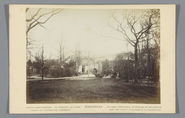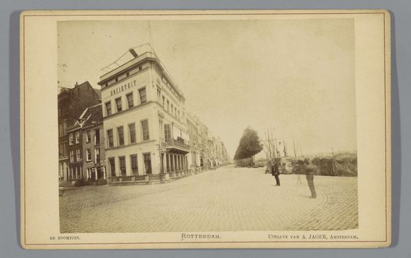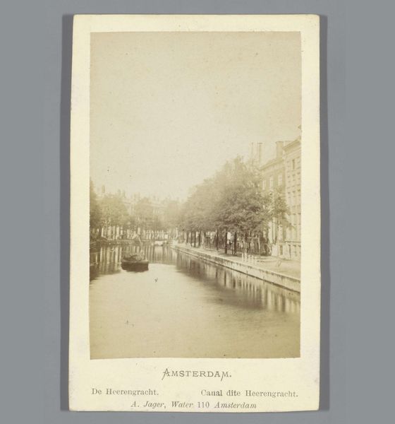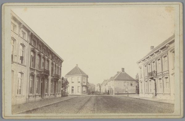 Editor: Here we have an anonymous photograph from between 1860 and 1890, titled "View of the Hogesluis in Amsterdam", rendered as a gelatin silver print. It strikes me as an oddly composed cityscape; the photographer seems very interested in the texture of the road, which takes up almost half the frame. What do you see in it? Curator: The appeal lies precisely in the exploitation of perspective and tone. Observe how the orthogonals of the cobbled street converge towards the vanishing point, creating a sense of depth that is quite effective despite the sepia tones. The image’s strength arises from its meticulous attention to surface qualities, particularly how light interacts with different materials, stone, brick and foliage. Do you notice how the textures, graded across the visual field, contribute to the photograph's aesthetic balance? Editor: I suppose so, but why prioritize the mundane surface of the road over the architecture, or the people who cross the bridge? Curator: Because the artist aims not merely to document but to transform reality through formal arrangement. Consider the composition as a self-contained system of lines, shapes, and tonal contrasts, almost as if the subject matter of architecture is entirely secondary. Note the stark contrast of the crisp architectural detail versus the relative blur in the distant dome structure. Editor: So, it’s about *how* we see, not *what* we see? Curator: Precisely. By emphasizing form over content, the photographer elevates the commonplace to the level of art. It’s less about historical accuracy and more about aesthetic sensation achieved by pictorial mechanics. Editor: I never considered looking at photography that way before, isolating its components rather than seeking immediate contextual meaning. Curator: Analyzing photography, not merely as document but form, grants new insight. It requires stripping assumptions for what is visually presented.