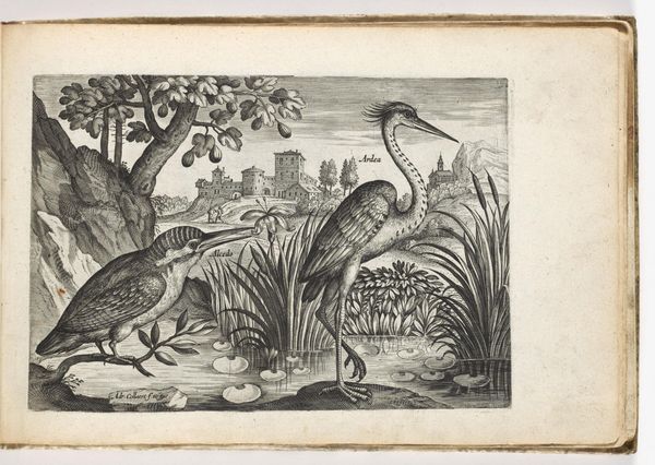 Curator: This is “Swan and Geese and Ducks by the Water,” a 1594 etching by Nicolaes de Bruyn, here in the collection of the Rijksmuseum. Editor: It's got a certain rustic charm, doesn't it? It reminds me of a children's book illustration, all carefully rendered birds and a simple background scene. It’s quite serene. Curator: Considering its creation as a print, it speaks to broader distribution. Its affordability likely widened access to landscape imagery and scenes of daily life during the Dutch Golden Age, impacting notions of nature and leisure among varied social classes. Think about the shift this enabled: ownership versus patronage. Editor: That's a key point. While wealthy patrons might commission original paintings of exotic birds, for instance, a print like this makes a kind of symbolic ownership attainable for a much wider audience. How were prints like these made and circulated, precisely? Was there a printmaker's guild, and did they regulate quality and price? Curator: Absolutely! The Guild of Saint Luke was pivotal. Regulations existed regarding apprenticeships, techniques, and the selling of prints. Quality was paramount, impacting sales and reputation. The engravers aimed to supply an increasing demand among an expanding merchant class eager to adorn their homes with these relatively accessible art pieces. Editor: You’re emphasizing that material and social nexus. How interesting! Now that you mention the burgeoning merchant class, this could act as a type of proto-advertisement for the consumption of fowl, if we assume this landscape alludes to areas nearby cities at the time. Or at least a gentle visual nudge, associating wealth and abundance with access to the land and its resources. Curator: A clever idea! This print prompts one to consider its reception in the broader cultural and economic tapestry of the time. Editor: Definitely something to reflect on further. What this piece shows to me is how accessibility transformed social dynamics in the early Dutch Republic. Curator: And how meticulous artistic practices shaped perception through mass media and imagery. A convergence of many important things!