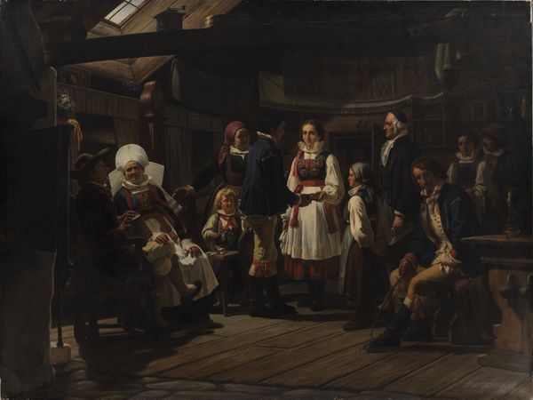 Curator: Let’s turn our attention to the spirited scene captured in "The Wedding Feast," attributed to Jan Steen. My immediate sense is one of joyous chaos, don't you think? The composition brims with lively figures rendered with gestural brushwork and earthy tones. Editor: I concur. There’s definitely a feeling of unrestrained energy radiating from the canvas. Observe the artist’s deployment of a warm toned palette. Browns, ochres, and greens coalesce, punctuated by fleeting flashes of red and blue that catch the eye, inviting us deeper into this moment. Curator: Precisely. And in keeping with that, the work is teeming with implied narratives regarding gendered spaces and rituals of the era, each of the revellers contributing to an atmosphere that certainly invites questions about expectations placed upon men and women as participants in societal practices around unions such as the depicted one. Note how even that sleeping figure to the left of the steps—presumably overcome by drink—underscores larger problems regarding masculine behavioral norms. Editor: That slumbering figure is positioned in masterful contrast, a locus of repose amidst frenetic activity. His form anchors the composition, but beyond narrative, I’m fascinated by the application of gouache. Look how it captures light as it falls, not rendering sharp detail, but, instead, an atmosphere brimming with vitality. Steen allows us merely glimpses. Curator: Absolutely, these fleeting glimpses hint at something I suspect many viewers can deeply connect with—the sometimes complicated social dynamics inherent at family-oriented gatherings such as the celebration portrayed in the scene; dynamics that involve, race, identity and familial pressures around love and kinship as performed under a watchful public eye. It serves, at once, as period piece but is, equally so, timeless observation. Editor: I can concede it’s quite intriguing how Steen managed to suggest movement while keeping details intentionally blurry using underpainting; allowing form, itself, to carry such an emotional load—suggesting everything but solidifying none of it! What do you suppose he's hoping to impart? Curator: Perhaps an observation on shifting standards for such traditions across time—challenging our perspectives and notions about what matrimony signifies to diverse subjects then, just as he invites each of us to ruminate now! Editor: In summary, Jan Steen delivers less a historical record than he grants entry into the sensation of revelry; both visually delightful and strangely pensive!