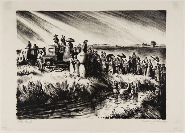 Editor: This is George Bellows's "The Bacchanale, Second Stone," a black and white print. It depicts a group of figures in what appears to be a chaotic celebration. There's a palpable sense of unrestrained revelry, but also a darker undercurrent. What historical context might inform how we interpret this scene? Curator: Bellows was very interested in social justice. This print, with its title evoking ancient, often violent, celebrations, could be a commentary on contemporary social issues. Perhaps the excesses and potential for exploitation within certain social strata. What power dynamics do you observe? Editor: I see figures who seem incapacitated, while others carry weapons and barrels. There is clearly an imbalance of power. Curator: Precisely. It's essential to consider how Bellows uses the bacchanal as a lens through which to critique his own time. The image is not merely documenting a party, it’s questioning who benefits and who suffers within these social structures. Editor: So, it's more than just a depiction of drunken revelry. It's a commentary on social inequality, framed through a historical lens. Curator: Exactly. This print invites us to critically examine power, privilege, and the potential for abuse within celebratory contexts.