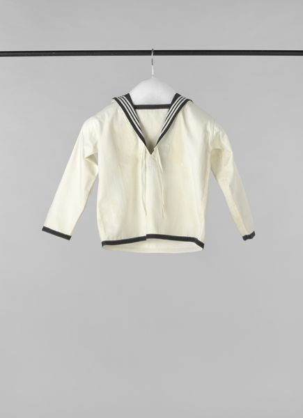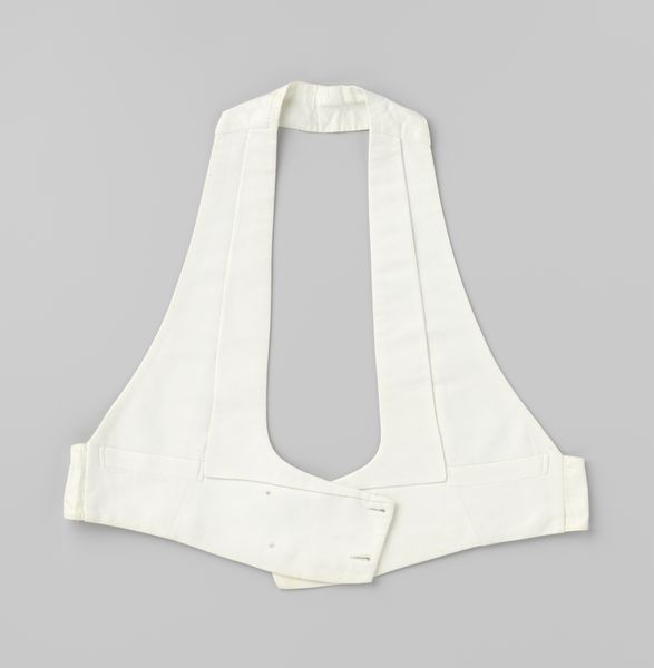 Curator: Here we have a seemingly simple object, a "Shirt with Short Sleeves, Small Model, Made at the Normal School in Deventer," dating back to around 1888-1894. The tag attributes it to G. Glas, and it appears to be made of textile. What strikes you first about it? Editor: It’s the utter plainness, almost…sterile. It feels so distant from today's elaborate clothing. What's there to see in something so basic? Curator: Ah, but that’s the trick, isn't it? The beauty in the everyday, in the utilitarian. It takes us back, almost like archaeology in cloth. Can you imagine the hands that made this, the students at the Deventer Normal School, diligently practicing their needlework? Were they dreaming of revolutionising haute couture, or simply mastering a craft? And the fibre art is almost drawing with thread, isn't it? Like sketching a life in linen. Editor: Drawing with thread, that's lovely. I suppose seeing it as a student piece changes things. Like seeing the effort. Was it a sample piece, do you think? Curator: It very well could have been a practice piece. The care taken in the stitching suggests that a more significant outcome was envisioned, or at least that there was some pride involved in its creation. Perhaps they weren’t all dreaming of fashion empires, but of making something functional and long-lasting. Now, I want you to step closer to it, if you were able. Close your eyes for a second... Now, open them! Can you almost *feel* the fibers of the cloth and envision this garment being used in everyday life? Editor: That… that's weirdly effective. It is easier to imagine. Almost like feeling the history in it. Curator: Exactly! It's the stories these textiles whisper that intrigue me most. Each stitch, a breath; each crease, a memory. Not as glamorous as a Van Gogh, perhaps, but no less vital. I almost imagine the ghost of the person that had to wear this shirt and I smile, knowing someone crafted something for them. A gift given in good spirit to another human. Editor: So it is about more than what you see, it is what you make of what you see. The stories are important. Thanks! Curator: Precisely! Until you connect with the hidden story it's a blank sheet! It's been an absolute pleasure sharing this little bit of linen with you!