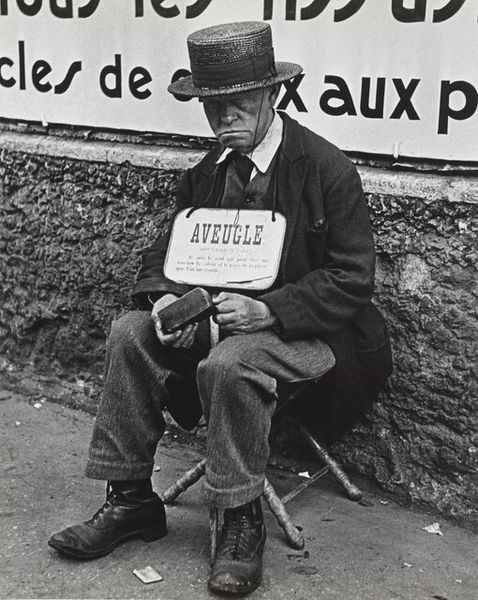 Editor: We're looking at Robert Frank's gelatin-silver print, "Elderly man with notice, Geneva," from 1945. The stark black and white tones give it a sense of gravity, almost a feeling of post-war anxiety. The man's holding a sign with some urgent text; it's all a bit puzzling. What do you see in this photograph? Curator: Ah, Frank. He had such an intuitive sense of capturing the zeitgeist. Look closer – the sign mentions "La charte des Nations Unies est votée" - The UN Charter has been ratified". There's also something about arresting Ribbentrop and nazi activity in neutral countries, quite powerful stuff when you consider that in 1945, the war had just ended. Do you notice how the lines of the building in the background echo the harshness of the text? And the man’s hat indicates he is Swiss...it is an observation about the Swiss position. Editor: Yes, I see what you mean. The sign almost seems to weigh him down, like a burden he has to carry. It’s a surprisingly direct statement, isn’t it? I guess I'm so used to more abstract post-war art. Curator: Precisely. Frank wasn't one for subtlety, I always thought. He just seemed to go for an absolute gut-punch. And look at how the light hits his face—worn, yet resolute. A small player in a very big game. Makes you think about the individual in the face of history, doesn’t it? I almost imagine that you might hear a bark if you approached him, I just see dogs when I view his images. I wonder where that came from? Editor: It really does. I hadn’t connected the Swiss neutrality angle either – that’s crucial for understanding it, thank you. I came to it just seeing one old man carrying a sign in an historical way. It does seem bigger, now! Curator: Exactly! It's like a visual poem capturing a specific moment and yet also timeless... A question mark to all who stumble upon it. What more can we want from art than such a conundrum?