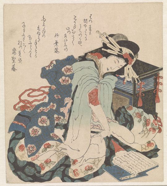 Editor: This is Utagawa Hiroshige's "Poet Ono no Komachi and Her Memorial Stone," a woodblock print. It's quite melancholic, with the poet looking down at the stone. What's your interpretation? Curator: I see a powerful commentary on the societal constraints placed on women, even in remembrance. Komachi, celebrated for her poetry, is here reduced to a passive figure gazing at her legacy. The stone becomes a symbol of patriarchal control over her narrative. How does that resonate with you? Editor: That's a perspective I hadn't considered. It definitely adds a layer of complexity to the image. I’ll rethink my reading of this. Curator: Consider how historical narratives often silence or distort women's voices. Reflecting on this piece in that light can open up powerful avenues for understanding its deeper message.