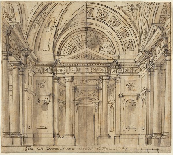 Editor: We're looking at Lorenzo Sacchetti's "Design for a Vaulted Hall," created with ink. It feels so grand, like peering into some ancient Roman bathhouse. What strikes you most when you look at this drawing? Curator: The soaring lines, right? It’s like a silent hymn to possibility. The ink…it's not just a medium, it’s a captured thought. Imagine Sacchetti, hunched over his table, the world shrinking as this vision unfolds. He wasn’t just drawing a building; he was composing a space for dreams, for echoes of history. What kind of dreams, though? Do you see more serenity or perhaps something…a little imposing? Editor: Imposing, definitely! There's something about those shadowed arches. Where do you think the light source is meant to be? Curator: Ah, that's the eternal artist’s game, isn't it? The light isn't just "there." It *performs*. See how it sculpts the curves, throws weight onto the pillars. Maybe Sacchetti wasn't aiming for perfect realism. Instead, maybe the light guides our emotions as much as our sight. Does it make you feel like *you're* standing in that hall? Editor: I see what you mean about the *feeling* of being there, despite it not being perfectly realistic, I think so. It does invite me in. It definitely puts me in the right mood to be open and contemplative. Curator: It is curious how lines and shade can conjure that, isn't it? Architecture becomes less about shelter and more about invitation. What if every building spoke like this? I'd linger longer in train stations. Editor: If only! Thanks, I see this in a totally new light now... pun intended! Curator: Glad to have offered another glimpse. Until our next visual adventure.