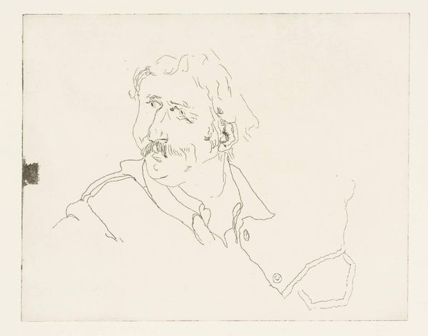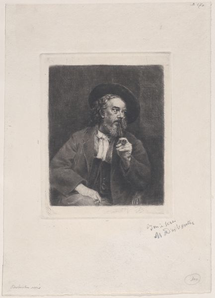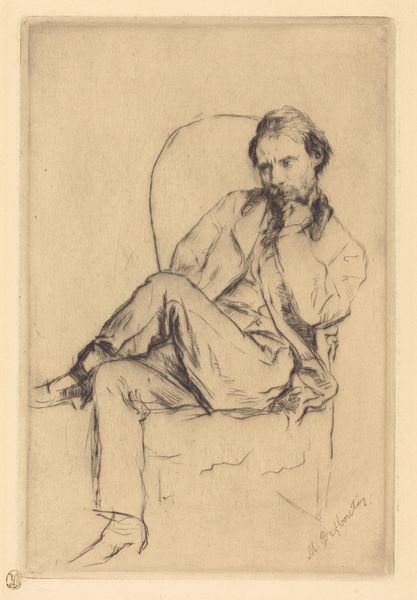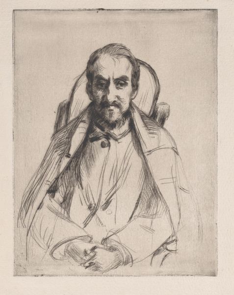Curator: Before us, we have Marcellin Desboutin's 1876 portrait of Henri Charles Guérard rendered meticulously in pencil. What is your initial take on this portrait drawing? Editor: My first impression is one of melancholy. There's a softness, almost a weary quality, in the sitter's expression and posture. The lightness of the pencil contributes to this subdued mood. Curator: Yes, I agree, the very fine, spare lines evoke a sense of understated elegance, don’t you think? Notice how Desboutin masterfully uses hatching and subtle variations in pressure to suggest form and volume, particularly in the face and beard. The textures achieved, however minimal, feel highly considered. Editor: Absolutely. I wonder about the relationship between Desboutin and Guérard. Both were involved in the Impressionist circle. Desboutin’s work capturing his fellow artists contributes to a fascinating record of Parisian artistic life during this period. These portrait drawings become significant cultural documents of the time. Curator: Precisely. The lines are not just descriptive; they convey an internal state, almost an atmosphere of intellectual contemplation. It’s the precision of the medium serving an almost spiritual quality, what the pencil omits becoming just as vital as what is defined. We find it interesting to ponder how Desboutin used the simple interplay between tone and void to create an almost haunting portrait. Editor: The informality of the pose strikes me too. Guérard isn’t rigidly posed but casually seated. This suggests a certain intimacy between artist and sitter, perhaps implying a more relaxed atmosphere within the Impressionist circle compared to earlier Salon portraiture. Curator: I agree completely. Perhaps that posture contributes significantly to the relaxed compositional strategy overall. Editor: It's a striking example of the kind of personal record being created alongside the larger Impressionist project. Curator: The ways that artists represent artists often exposes cultural dynamics in unique ways. Editor: Precisely. It makes me look at this school of artwork through another, more subtle lens.