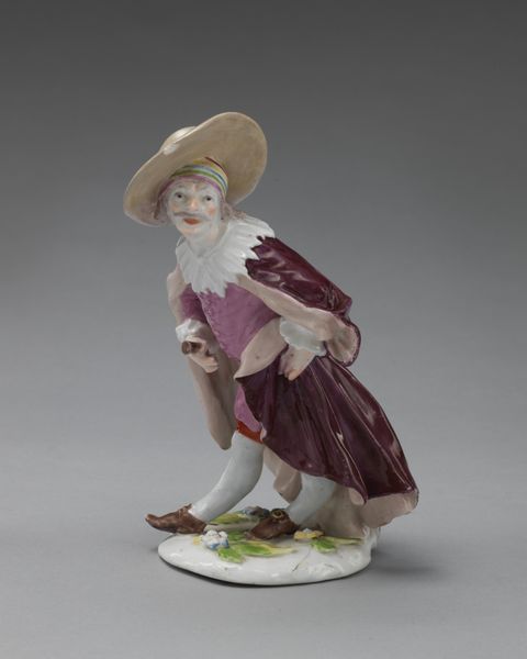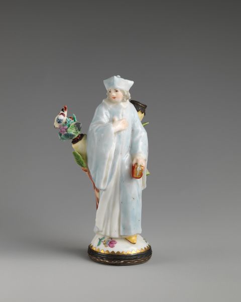 Editor: This lovely porcelain figure, "Four Seasons (Summer)" by the Chelsea Porcelain Manufactory, dating from about 1753 to 1755, has a delicate, almost dreamlike quality. She’s carrying what looks like wheat, maybe? What do you see in this piece, especially thinking about its imagery? Curator: This figure embodies summer’s abundance through visual symbolism. The figure cradles a sheaf of wheat, a millennia-old symbol associated with the harvest, fertility, and nourishment. It's interesting to consider how these symbols, originally rooted in agricultural societies, were adopted and reinterpreted within the context of 18th-century aristocratic decorative arts. How do you think the original audience would have viewed this figure? Editor: I imagine they saw it as both decorative and symbolic, like a little emblem of wealth and prosperity, but in a very refined way, for their homes. Almost like a celebration of their status, perhaps? Curator: Precisely. Notice the details: the flowers at her feet root her in growth, while her serene gaze embodies contentment. The very material – porcelain – was a symbol of wealth and sophistication in that era. It shows us their continuous connection to a vision of fruitful and peaceful nature. It wasn't merely decoration, it was a miniature emblem of the social order they inhabited, a silent expression of their world. Editor: That makes the piece even richer, understanding all those layers of meaning embedded in something that appears so simple. Thanks! Curator: My pleasure. Art helps us decipher the past. It’s an unending, mutual discovery!
