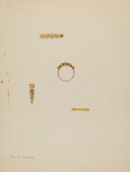 Editor: Here we have Gladys Cook’s "Bracelet," a watercolor drawing from around 1936. It strikes me as quite minimal and austere, even with the ornamentation. What stands out to you about this piece? Curator: I’m intrigued by the choice of jewelry as subject matter during the Depression era. Do you see a potential tension between the display of luxury, however modest in its representation here, and the social realities of the time? Editor: That’s a really interesting point. I hadn’t considered the social context. It almost feels like a quiet act of defiance or perhaps a yearning for better times. Curator: Exactly! And it leads me to wonder, who was this intended for? Was it a personal expression, a design study, or perhaps something else entirely? What kind of narratives were women allowed to construct around adornment and self-image back then? Editor: It's amazing how much can be unpacked from such a seemingly simple drawing. It's not just about aesthetics; it's about power, class, and gender roles, too. Curator: Absolutely. Consider the materials – watercolor on paper. It lacks the inherent value of the jewelry itself. What statement, then, does the choice of medium make about value and representation? It invites us to reflect on our contemporary consumption and materialism. Editor: I never would have thought about it that way! It's incredible how approaching art with social consciousness can open up so many layers of meaning. Curator: Precisely! Art isn’t created in a vacuum. By examining the artwork and its cultural environment together, we create new narratives.